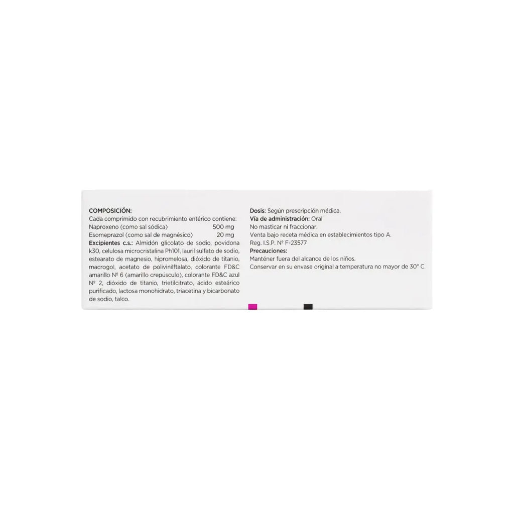 Cada comprimido contiene Naproxeno 500 mg y Esomeprazol 20 mg, con recubrimiento entérico para proteger el principio activo y asegurar una mejor tolerabilidad.