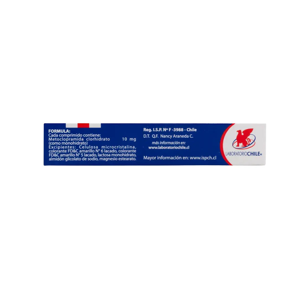 Cada comprimido contiene Metoclopramida Clorhidrato 10 mg.